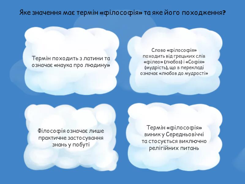 1) Яке значення має термін «філософія» та яке його походження? a) Термін походить з латини та означає «наука про людину» b) Слово «філософія» походить від грецьких слів «філео» (любов) і «Софія» (мудрість), що в перекладі означає «любов до мудрості» c) Філософія означає лише практичне застосування знань у побуті d) Термін «філософія» виник у Середньовіччі та стосується виключно релігійних питань 2) Хто вперше вжив термін «філософія», а хто — як назву галузі знань? a) Піфагор і Платон b) Платон і Сократ c) Сократ і Арістотель d) Арістотель і Піфагор 3) Що таке філософія? a) Практичне мистецтво ведення дискусій b) Збірка релігійних правил і обрядів c) Наука про фізичні явища природи d) Теоретичний світогляд, що прагне осягнути всезагальне у світі, людині й суспільстві 4) Що для релігії є абсолютним началом світу? a) Людина b) Природа c) Свідомість d) Бог 5) У чому полягає специфіка філософського знання? a) У чіткому укоріненні фактів b) У використанні художніх образів c) У надзагальності та ґрунтуванні на засадах розуму d) У відмові від будь-якого зв’язку з дійсністю 6) Який розділ філософії є вченням про буття? a) Онтологія b) Гносеологія c) Етика d) Логіка 7) Який розділ філософії вивчає сутність, форми і закони пізнання і мислення? a) Онтологія b) Гносеологія c) Діалектика d) Аксіологія 8) Яка функція філософії пов’язана з поясненням світу та формуванням цілісного бачення дійсності? a) Прогностична b) Освітня c) Світоглядна d) Соціальна 9) Яка функція філософії сприяє формуванню гуманістичних цінностей та позитивного сенсу життя? a) Гуманістична b) Аксіологічна c) Світоглядна d) Соціальна 10) Що відрізняє світогляд від інших форм знання? a) Він завжди має суто науковий характер b) Він ґрунтується лише на художніх образах c) Він є баченням світу з позиції людини та формує її життєву позицію d) Він повністю позбавлений суб’єктивного значення 11) Що є ключовими поняттями світогляду? a) Природа і суспільство b) Наука і мистецтво c) Ідеали та релігія d) Світ і людина 12) Яка є основна функція світогляду? a) Духовне проектування життя, визначення головних орієнтирів і сенсу існування b) Пошук наукових законів природи c) Формування логічних методів пізнання d) Опис природних і соціальних явищ 13) Хто може бути носієм та виразником світогляду? a) Лише окрема людина b) Тільки соціальна група c) Окрема людина, соціальна група, клас, етнос, суспільство загалом d) Лише науковці 14) Які основні компоненти входять до структури світогляду? a) Пізнавальний, ціннісний і мотиваційно-діяльний b) Теоретичний і практичний c) Міфологічний, релігійний і філософський d) Науковий, художній і релігійний 15) Які основні рівні існують у структурі світогляду? a) Теоретичний і практичний b) Життєво-практичний і теоретичний c) Науковий і художній d) Міфологічний і релігійний 16) Які історичні типи світогляду виділяють в історії людської культури? a) Наука, мистецтво, релігія b) Теоретичний, життєво-практичний c) Художній, науковий, практичний d) Міфологія, релігія, філософія 17) Що є основою світосприйняття у міфологічному світогляді? a) Логічне мислення і доведення b) Віра c) Наукове пізнання d) Художньо-образне, символічне відображення, уява, глибинне почуття єдності людини і природи 18) Яка з наведених ролей не входить до сучасного значення філософії? a) Розуміння сенсу людського життя b) Розв’язання етичних дилем c) Виключно зап