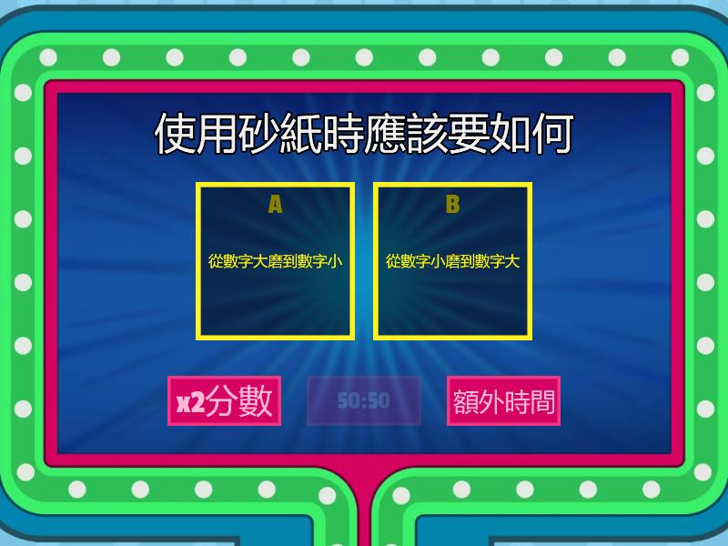 1) 請問這是什麼 a) 線鋸 b) 手鋸 c) 電鋸 2) 請問這是什麼 a) 手磨鑽 b) 螺絲 c) 螺絲起子 d) 剪刀 3) 請問這是什麼 a) 西卡紙 b) 砂紙 c) A4紙 4) 使用砂紙時應該要如何 a) 從數字大磨到數字小 b) 從數字小磨到數字大 5) 發條機器的轉動原理沒有什麼 a) 彈力鐵條的彈力 b) 齒輪轉動 c) 偏心輪轉動 d) 槓桿原理 6) 生科課的重點是什麼 a) 盡情體驗動手DIY! b) 上課睡覺,下課噓噓 c) 全部讓老師做