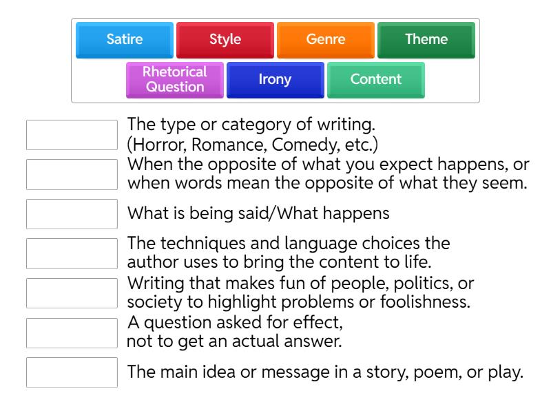 Content - What is being said/What happens, Style - The techniques and language choices the author uses to bring the content to life., Theme - The main idea or message in a story, poem, or play., Genre - The type or category of writing. (Horror, Romance, Comedy, etc.), Rhetorical Question - A question asked for effect, not to get an actual answer., Satire - Writing that makes fun of people, politics, or society to highlight problems or foolishness., Irony - When the opposite of what you expect happens, or when words mean the opposite of what they seem.,