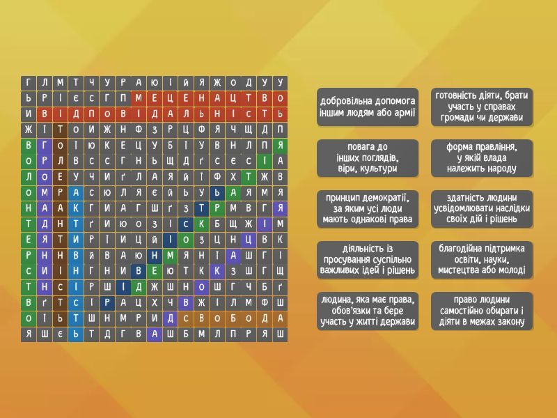 демократія - форма правління, у якій влада належить народу, громадянин - людина, яка має права, обов’язки та бере участь у житті держави, відповідальність - здатність людини усвідомлювати наслідки своїх дій і рішень, активність - готовність діяти, брати участь у справах громади чи держави, толерантність - повага до інших поглядів, віри, культури, рівність - принцип демократії, за яким усі люди мають однакові права, свобода - право людини самостійно обирати і діяти в межах закону, волонтерство - добровільна допомога іншим людям або армії, адвокація - діяльність із просування суспільно важливих ідей і рішень, меценацтво - благодійна підтримка освіти, науки, мистецтва або молоді,