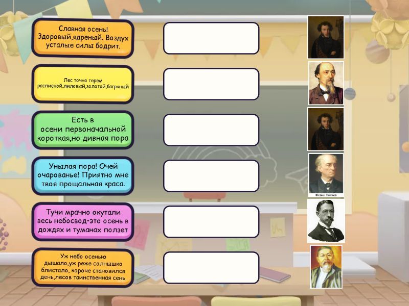 Славная осень! Здоровый,ядреный. Воздух усталые силы бодрит., Уж небо осенью дышало,уж реже солнышко блистало, короче становился день,лесов таинственная сень, Лес точно терем расписной,лиловый,золотой,багряный, Тучи мрачно окутали весь небосвод-это осень в дождях и туманах ползет , Есть в осени первоначальной короткая,но дивная пора, Унылая пора! Очей очарованье! Приятно мне твоя прощальная краса.,