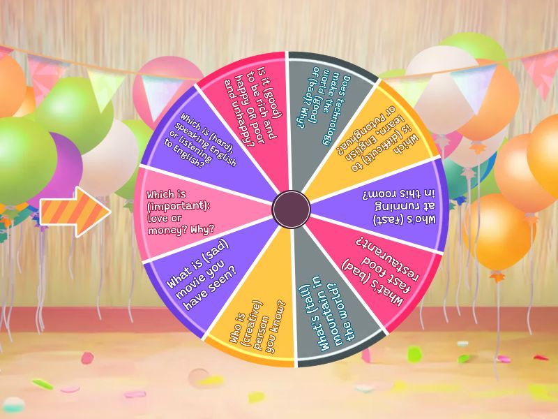 1) Which is (hard), speaking English or listening to English? 2) Is it (good) to be rich and happy OR poor and unhappy? 3) Does technology make the world (good) of (bad)? Why? 4) Which is (difficult) to learn, English or Putonghua? 5) Who’s (fast) at running in this room? 6) What's (bad) fast food restaurant? 7) What’s (tall) mountain in the world? 8) Who is (creative) person you know? 9) What is (sad) movie you have seen? 10) Which is (important): love or money? Why?