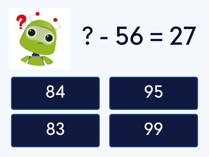 1) ? - 56 = 27 a) 84 b) 95 c) 83 d) 99 2) 46 - ? = 8 a) 36 b) 26 c) 38 d) 16 3) 67 - ? = 8 a) 48 b) 59 c) 49 d) 55 4) ? - 25 = 29 a) 56 b) 54 c) 44 d) 64 5) ? - 27 = 16 a) 42 b) 43 c) 32 d) 54 6) 91 - ? = 85 a) 6 b) 14 c) 16 d) 5 7) ? - 17 = 59 a) 75 b) 76 c) 66 d) 78 8) 86 - ? = 27 a) 53 b) 48 c) 46 d) 56 9) 92 - ? = 38 a) 44 b) 54 c) 38 d) 48 10) ? - 29 = 53 a) 92 b) 72 c) 82 d) 74