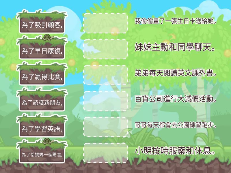 為了學習英語, - 弟弟每天閱讀英文課外書。, 為了吸引顧客, - 百貨公司進行大減價活動。, 為了贏得比賽, - 哥哥每天都會去公園練習跑步。, 為了早日康復, - 小明按時服藥和休息。, 為了給媽媽一個驚喜, - 我偷偷畫了一張生日卡送給她。, 為了認識新朋友, - 妹妹主動和同學聊天。,