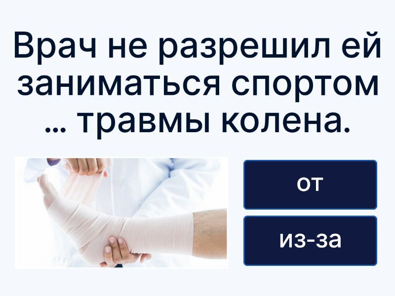 1) ... жары она потеряла сознание. a) От b) Из-за 2) ... жары мы решили остаться в отеле, где работал кондиционер. a) От b) Из-за 3) ... страха у него изменился цвет лица. a) От b) Из-за 4) Он умер ... хронической болезни. a) от b) из-за 5) ... болезни он должен был соблюдать постельный режим. a) От b) Из-за 6) Он не смог прийти ... этой проблемы. a) от b) из-за 7) У неё покраснели щёки ... мороза. a) от b) из-за 8) ... усталости она сразу уснула. a) От b) Из-за 9) Я бы сейчас съел слона. Я просто умираю ... голода. a) от b) из-за 10) Он весь дрожал ... холода. a) от b) из-за 11) ... холодной погоды людям приходится надевать шапки. a) От b) Из-за 12) Она всегда толстеет ... гамбургеров. a) от b) из-за 13) Мы опоздали в аэропорт ... тебя. a) от b) из-за 14) ... счастья она пела и танцевала. a) от b) из-за 15) Когда он об этом узнал, он прыгал ______ радости. a) от b) из-за 16) У неё болит голова ... громкой музыки. a) от b) из-за 17) Он перенёс встречу ... гриппа. a) от b) из-за 18) Он похудел ... сильного стресса. a) от b) из-за 19) ... аллергии ему пришлось отменить поездку. a) От b) Из-за 20) У неё покраснели глаза ... усталости. a) от b) из-за 21) У неё болели мышцы ... интенсивной тренировки. a) от b) из-за 22) Врач не разрешил ей заниматься спортом ... травмы колена. a) от b) из-за 23) Ребёнок не пошёл в школу ... высокой температуры. a) от b) из-за 24) Он постоянно кашлял ... бронхита. a) от b) из-за 25) У неё кружилась голова ... низкого давления. a) от b) из-за