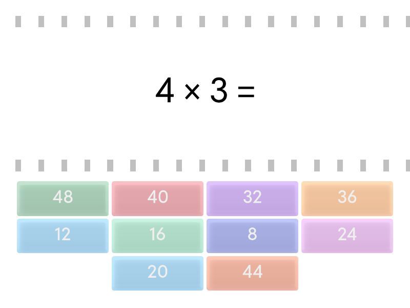 12 - 4 × 3 =, 40 - 4 × 10 =, 36 - 4 × 9 =, 48 - 4 × 12 =, 24 - 4 × 6 =, 8 - 4 × 2 =, 16 - 4 × 4 =, 44 - 4 × 11 =, 32 - 4 × 8 =, 20 - 4 × 5 =,