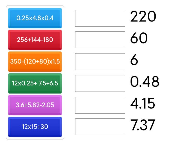 3.6+5.82-2.05 - 7.37, 12x0.25+ 7.5÷6.5 - 4.15, 256+144-180 - 220, 12x15÷30 - 6, 350-(120+80)x1.5 - 60, 0.25x4.8x0.4 - 0.48,