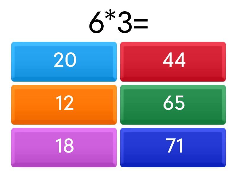 1) 6*3= a) 20 b) 44 c) 12 d) 65 e) 18 f) 71 2) 9*5= a) 45 b) 42 c) 54 d) 12 e) 48 f) 81 3) 4*6= a) 24 b) 56 c) 16 d) 72 e) 28 f) 18 4) 5*8= a) 46 b) 28 c) 40 d) 32 e) 24 f) 16 5) 7*3= a) 21 b) 45 c) 26 d) 63 e) 18 f) 28 6) 9*2= a) 18 b) 24 c) 32 d) 48 e) 27 f) 28 7) 6*8= a) 48 b) 32 c) 24 d) 81 e) 64 f) 36 8) 3*4= a) 21 b) 36 c) 12 d) 15 e) 24 f) 18 9) 4*7= a) 27 b) 32 c) 49 d) 63 e) 28 f) 72 10) 8*8= a) 63 b) 64 c) 72 d) 35 e) 48 f) 90