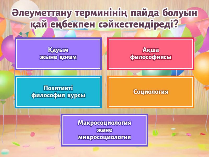 1) Әлеуметтану терминінің пайда болуын қай еңбекпен сәйкестендіреді? a) Қауым жыне қоғам b) Ақша философиясы c) Позитивті философия курсы d) Социология e) Макросоциология және микросоциология 2) «Айнадағы мен» теориясы қандай процесті түсіндіреді? a) Девиацияны b) Аномияны c) әлеуметтендіру процесі d) Эволюцияны e) Циклді 3) Адам психикасының құрылымы туралы теорияның негізін салушы кім? a) Дж. Хоманс b) А. Шюц c) З. Фрейд d) Ч. Кули e) Э. Мейо 4) Қоғамда бейімделушілік қызметін атқаратың қандай жүйе? a) Саяси b) Мәдени c) Әлеуметтік d) Құқықтық e) Ғылыми 5) «Әлеуметтік қызмет және әлеуметтік құрылым» еңбегінің авторы кім? a) Г. Спенсер b) Т. Парсонс c) Р. Мертон d) П. Сорокин e) О. Конт 6) Қоғамға, адамға арналған маңызды мақсат не? a) Норма b) Талап c) Құндылық d) Қажеттілік e) Әрекет 7) О. Конт қоғам дамуын қандай кезеңдерге бөлді? a) метафизикалық, дәстүрлі b) классикалық, модерн c) теологиялық, метафизикалық, позитивтік d) теологиялық, модерн, казіргі e) модерн, метафизикалық 8) Тұлғаның қоғамдық өмірге белсенді араласуын насихаттайтын доктрина қандай? a) Информациялық b) Демогогиялық c) Динамикалық d) Догматикалық e) Саяси 9) Әлеуметтанудың классиалық кезеңінің өкілдері кімдер? a) М.Вебер, Э.Дюркгейм b) Р.Мертон, Т.Парсонс c) О.Конт, Г.Спенсер d) Д.Мид, Ч.Кули e) У.Томас, Ф.Знанецкий 10) М.Вебердің пікірінше, қандай қоғамда индивидтердің іс-әрекеті рационалды принципке негізделеді? a) Аграрлы b) Өндірістік c) Дәстүрлі d) Модернистік e) Қазіргі 11) Индивидтің іс-әрекетін өмір сүретін әлеуметтік құрылымы арқылы зерттеген бағыт қандай? a) Марксизм b) Феноменология c) Құрылымдық функционализм d) Этнометодология e) Айырбас теориясы 12) Аномия мен девиацияны алғаш әлеуметтік тұрғыдан түсіндірген ғалымды анықтаңыз: a) Г. Спенсер b) М. Вебер c) Э. Дюркгейм d) О. Конт e) Т. Парсонс 13) Әлеуметтік сипатына қарай бөлінетін адамдар жиынтығы дегеніміз не? a) Престиж b) Статус c) Топ d) Тап e) Институт 14) Әлеуметтану дегеніміз не? a) Діни көзқарастар туралы b) Саяси және әлеуметтік өмір туралы c) Индивидтердің әлеуметтік өмірі туралы ғылым d) Этикалық құндылықтар туралы e) Жеке адамның мінез-құлқы туралы 15) Әлеуметтанудың қай түрі әлеуметтік мәселелерді практикалық іс жүзінде шешуге бағытталады? a) діндік b) теориялық c) қолданбалы d) абстрактылық e) иллюзиялық бейне 16) Позитивизмнің дамуына үлес қосқан ғалым кім? a) А.Щюц b) Дж.Морена c) О.Конт d) Э.Мэйо e) Дж.Мид 17) Сопылық бағытты ұстаған кім? a) Қорқыт b) Қашқари c) Иссауи d) Баласағұн e) Әл-Фараби 18) О.Конттың пікірінше қоғамның негізгі бірлігі неде? a) Жек адам b) Әлеуметтік топ c) Отбасы d) Қарым-қатынас e) Қоғам 19) Нормалық жүйенің негізгі элементі не? a) Қарапайым b) Мақсатты- рационализм c) Салт- дәстүр d) Күрделі e) Эффективті 20) "Социология" деген сөз алғаш рет қашан пайда болды? a) 1750ж b) 20 ғ басында c) 19ғ.40ж d) Б.з.3 ғ e) 19ғ соңында