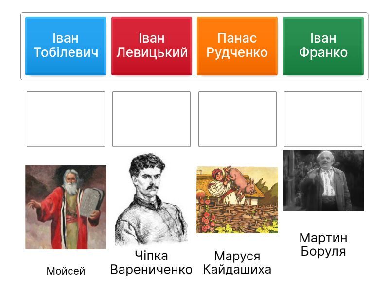 Іван Левицький - Маруся Кайдашиха, Іван Франко - Мойсей, Іван Тобілевич - Мартин Боруля, Панас Рудченко - Чіпка Варениченко,