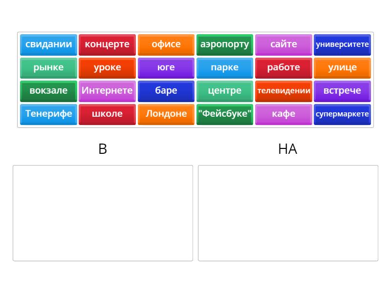В: школе, баре, кафе, Лондоне, парке, центре, университете, супермаркете, Интернете, "Фейсбуке", аэропорту, офисе, НА: концерте, встрече, работе, Тенерифе, вокзале, уроке, улице, юге, рынке, телевидении, сайте, свидании,