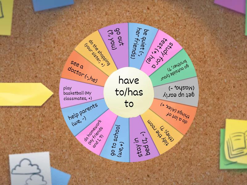 see a doctor (-,he), do the shopping (your sister, +), go out (?, you), be quiet (-, her friends), study for a test (+, he), go outside (your brother, ?), get up early (Masha, -), do a lot of things (Alex, +), tidy the room (they, ?), stay in bed (I, -), go to school (we,+), do homework (My friends and I, ?), help parents (we, -), play basketball (My classmates, +).