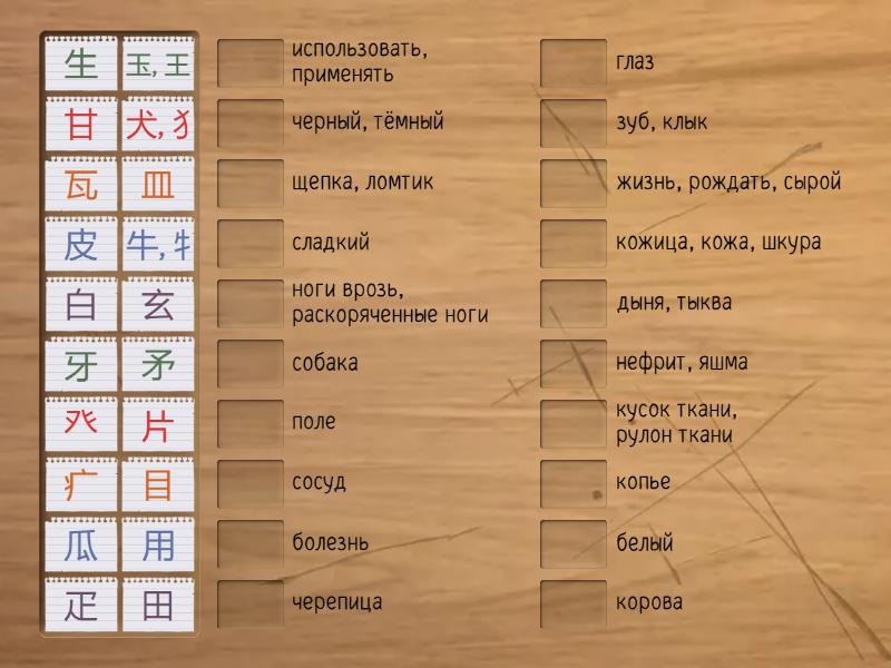 片 - щепка, ломтик, 牙 - зуб, клык, 牛, 牜 - корова, 犬, 犭 - собака, 玄 - черный, тёмный, 玉, 王 - нефрит, яшма, 瓜 - дыня, тыква, 瓦 - черепица, 甘 - сладкий, 生 - жизнь, рождать, сырой, 用 - использовать, применять, 田 - поле, 疋 - кусок ткани, рулон ткани, 疒 - болезнь, 癶 - ноги врозь, раскоряченные ноги, 白 - белый, 皮 - кожица, кожа, шкура, 皿 - сосуд, 目 - глаз, 矛 - копье,