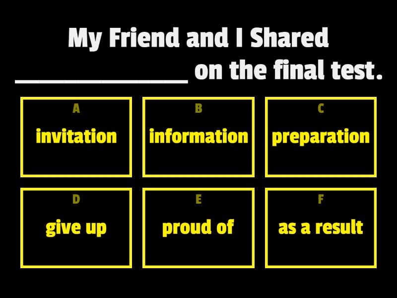 1) My Friend and I Shared ______________ on the final test. a) invitation b) information c) preparation d) give up e) proud of f) as a result 2) John accepted the _____________ to the birthday party. a) invitation b) information c) preparation d) give up e) proud of f) as a result 3) __________________ for the opening ceremony needed a lot of work. a) invitation b) information c) preparation d) give up e) proud of f) as a result 4) It is not easy to read an entire book. in English, but I will never _______________________. a) invitation b) information c) preparation d) give up e) proud of f) as a result 5) The water in the pond is dirty. _______________________ the number of fish is in it is decreasing. a) invitation b) information c) preparation d) give up e) proud of f) As a result 6) The teacher was __________________ her students because they performed the project well. a) invitation b) information c) preparation d) give up e) proud of f) as a result