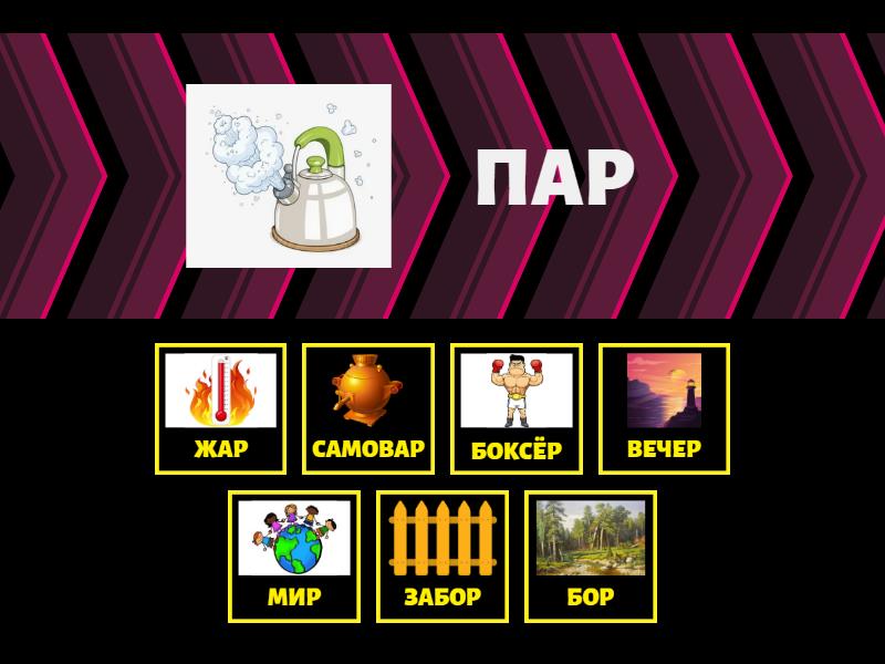 ЖАР - ПАР, САМОВАР - КОМАР, БОР - ХОР, ЗАБОР - ТОПОР, МИР - ЖИР, ВЕЧЕР - ВЕТЕР, БОКСЁР - КОВЁР,