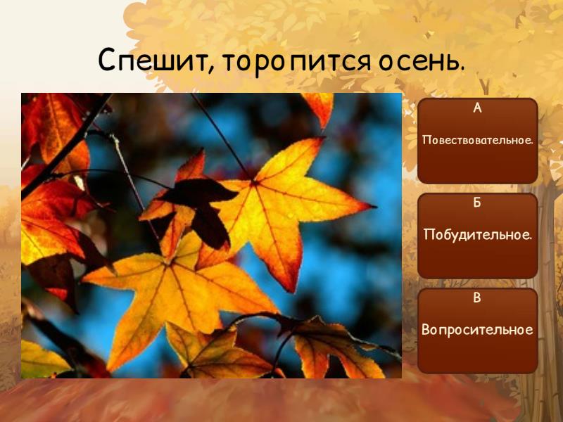 1) Спешит, торопится осень. a) Повествовательное. b) Побудительное. c) Вопросительное 2) Спешит, торопится осень. a) восклицательное b) невосклицательное 3) Спешит, торопится осень. a) простое b) сложное 4) Спешит, торопится осень. a) распространенное b) нераспространенное 5) Спешит, торопится осень. a) односоставное b) двусоставное 6) Спешит, торопится осень. a) Не осложнено b) осложнено обращением c) осложнено однородными сказуемыми d) осложнено однородными подлежащими