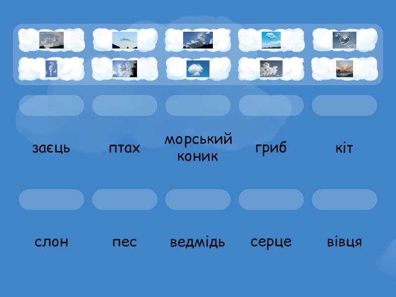 кіт, вівця, слон, морський коник, ведмідь, пес, гриб, серце, птах, заєць,