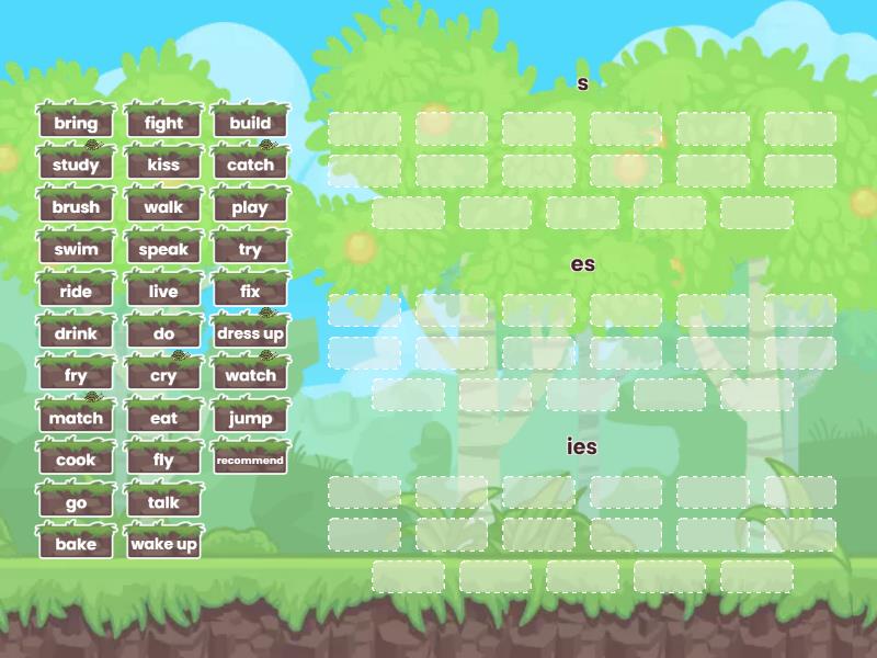 s: talk , walk , bring , recommend , play , fight , jump , swim , ride , bake , cook , eat, drink , speak , live , wake up , build, es: go , do , match, catch , dress up , kiss , watch, brush , fix , ies : cry , fly , try , fry , study ,