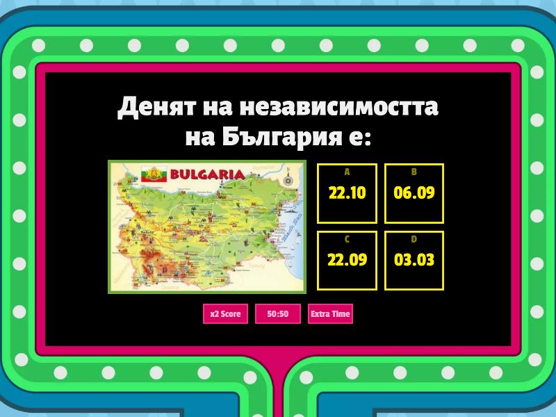 1) Денят на независимостта на България е: a) 22.10 b) 06.09 c) 22.09 d) 03.03 2) Кога е подписан фермана за учредяване на Българската екзархия? a) 27 януари 1870 г. b) 27 февруари 1870 г. c) 17 февруари 1681 г. d) 18 юни 1870 г. 3) Какъв цвят на езика имат жирафите? a) жълт b) червен c) оранжев d) син
