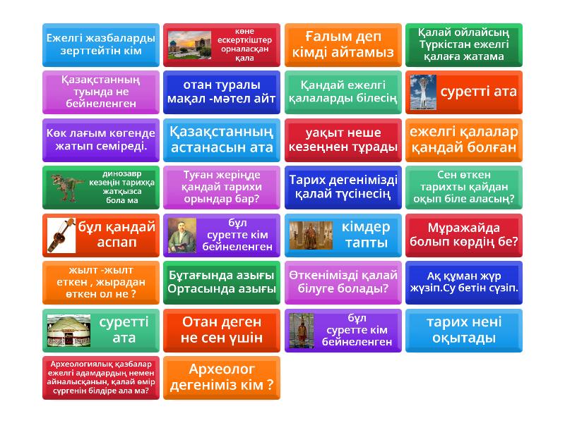 Археолог дегеніміз кім ?, жылт -жылт еткен , жырадан өткен ол не ?, Тарих дегенімізді қалай түсінесің, Қандай ежелгі қалаларды білесің , Қалай ойлайсың Түркістан ежелгі қалаға жатама , Өткенімізді қалай білуге болады?, Археологиялық қазбалар ежелгі адамдардың немен айналысқанын, қалай өмір сүргенін білдіре ала ма?, Сен өткен тарихты қайдан оқып біле аласың?, Мұражайда болып көрдің бе?, Туған жеріңде қандай тарихи орындар бар?, отан туралы мақал -мәтел айт , Отан деген не сен үшін , бұл суретте кім бейнеленген, көне ескерткіштер орналасқан қала , кімдер тапты , бұл қандай аспап, бұл суретте кім бейнеленген, динозавр кезеңін тарихқа жатқызса бола ма , уақыт неше кезеңнен тұрады , Ежелгі жазбаларды зерттейтін кім, тарих нені оқытады , ежелгі қалалар қандай болған, суретті ата, Ғалым деп кімді айтамыз , Көк лағым көгенде жатып семіреді., Бұтағында азығы Ортасында азығы, Ақ құман жүр жүзіп.Су бетін сүзіп., Қазақстанның астанасын ата, Қазақстанның туында не бейнеленген, суретті ата,