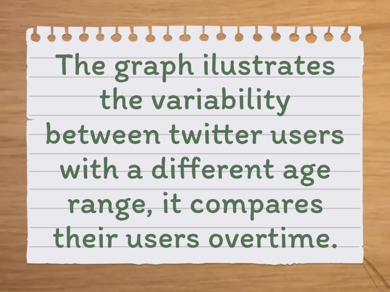 The graph ilustrates the variability between twitter users with a different age range, it compares their users overtime. - The graph illustrates the variability between Twitter users with a different age range ; it compares their use overtime., Old people who are 65 years and over usually are remained flat during all years. - The percentage of 65+ Twitter users remained stable over the time period., …, where as the group of 65 year old and plus people marks the lowest, which suggests… - ..., whereas the 65+ group marks the lowest, which suggests..., By contrast, with the group 65+, they were dipped during the time. - By contrast, Twitter use in the 65+ category dipped during this time. , Today the document is a graphic, who represent the pourcentage of the population who… - This line graph represents the percentage of the US population who..., However, on August 2012 showed a hit a peak and then deeped on December 2012. - However, in August 2012, it hit a peak (of 32) before dipping and then reaching 30% in May 2013., These differences cause from how people spend times in childhood. - These differences may be caused by how people spent their time in childhood." BUT: DELETE- THIS IS NOT REQUIRED AND IS SPECULATION., …this graph fluctuated during 2010 to 2011 then … - ... Twitter use fluctuated from 2010 to 2011, then..., General speaking, we can see how Twitter kept incresing in all different age group. - Generally speaking, we can see how Twitter use kept increasing in all different age groups., …the prevalent ones are the ones between 18 and 29 years old which is notorious increasing. - ...the prevalent ones are the ones between 18 and 29 years, which is constantly/ continuously increasing. (BUT, IS IT?). , The 18-29 age group shows a notable soared between… - The 18-29 group shows a notable soar/ rise/ growth between... ,