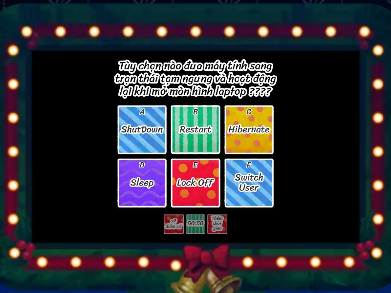 1) Tùy chọn nào đưa máy tính sang trạn thái tạm ngưng và hoạt động lại khi mở màn hình laptop ???? a) ShutDown b) Restart c) Hibernate d) Sleep e) Lock Off f) Switch User 2) Nguyên nhân phổ biến gây lỗi cho CPU là ??? a) Gỡ bỏ các thiết bị không đúng quy trình b) Truy cập các trang web không an toàn c) Quá nóng d) Không đủ dung lượng ổ cứng 3) Phần mềm quản lý thông tin cá nhân bao gồm email, lịch và quản lý các tác vụ ??? a) Microsoft PowerPoint b) Microsoft Access c) Microsoft Word d) Microsoft Excel e) Microsoft Outlook f) Microsoft OneNote 4) Bảo quản máy tính cẩn thận là .... ?? a) Để đồ ăn, nước uống lên máy tính b) Dùng ổ đĩa làm thiết bị đặt cốc (ly) c) Để nam châm xung quanh hoặc trên máy tính d) Chỉ sử dụng nước lau kính lau manf màn hình LCD e) Vệ sinh máy bằng xà phòng f) Giữ máy tính không quá nóng hoặc quá lạnh 5) Mục đích của hệ điều hành là ..... ???? a) Quản lý phần cứng và ứng dụng b) In tài liệu c) Hiển thị hình ảnh d) Trợ giúp kết nối với máy tinh hoặc thiết bị khác e) Lên mạng f) Tra cứu tài liệu 6) Thay dổi múi giờ trên máy tính Window 7 như thế nào ??? a) Nhấp chuột vào vùng bất kỳ trên Desktop b) Nhấp chuột trái vào góc phải màn hình c) Nhấp chuột phải vào Start d) Nhấp chuột phải vào góc dưới thanh tác vụ e) Nhấp chuột phải vào googleChrome 7) Phần mềm hoăc ứng dụng nhỏ giúp sữa lỗi và vá các lỗ hổng cho chương trình khác ??? a) Virus b) Upgrade c) Patch d) Operating system e) Driver 8) Bàn phím là thiết bị ???? a) Nhập (input device) b) Xuất (Output device) c) Truy cập mạng (network device) d) In ấn (pritnt device) 9) Giấy phép cần mua cho bộ Office cho trường học ??? a) Single Seat b) Business License c) Site License d) Home License 10) Tài liệu mẫu là gì ? a) Một bảng tính b) Một tài liệu chỉ đọc c) Một bảng hướng dẫn d) Một tài liệu mẫu sẵn sàng sử dụng 11) Phần mềm nào dùng để viết báo cáo ??? a) Microsoft Excel b) Microsoft PowerPoint c) Microsoft Word d) Microsoft OutLook e) Microsoft OneNote f) Microsoft Access 12) Nén tập tin là gì ? a) Làm tăng kích thước tập tin b) Làm tập tin bị biến dạng c) Xóa tập tin d) Lưu tập tin e) Tạo ta tập tin có kích thước nhỏ hơn f) Di chuyển tập tin 13) Thiết bị giúp mang bài tập trên máy tính ở nhà đến trường là ????? a) Ổ Flash b) CPU c) Máy tính để bàn d) Laptop e) Điện thoai di động f) Ổ cứng máy tính 14) Máy tính hoặc laptop của bạn không hư hại gì nhưng không thể kích hoạt, tại sao lại như thế ????? Do thiết bị nào khác bị hư hỏng sao a) Graphics card b) Sound Card c) Monitor (màn hình) d) Power Supply e) KeyBoard 15) Phần mềm nào là Hệ Điều Hành ??? a) Microsoft Word b) Apple Ipad c) Google d) Paint e) Microsoft Windows 16) Công cụ giúp sao lưu dữ liệu ???? a) b) c) d)