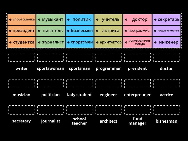 журналист - journalist, актриса - actrice, руководитель фонда - fund manager, предприниматель - enterpreuner, студентка - lady student, учитель - school teacher, спортсменка - sportswoman, архитектор - architect, писатель - writer, спортсмен - sportsman, президент - president, доктор - doctor, программист - programmer, инженер - engineer, секретарь - secretary, бизнесмен - bisnesman, политик - politician, музыкант - musician,