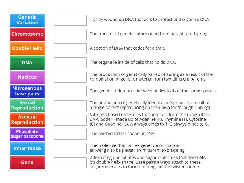 DNA - The molecule that carries genetic information allowing it to be passed from parent to offspring., Gene - A section of DNA that codes for a trait., Chromosome - Tightly wound up DNA that acts to protect and organise DNA., Nitrogenous base pairs - Nitrogen based molecules that, in pairs, form the rungs of the DNA ladder - made up of Adenine (A), Thymine (T), Cytosine (C) and Guanine (G). A always binds to T. C always binds to G., Phosphate sugar backbone - Alternating phosphates and sugar molecules that give DNA it's double helix shape. Base pairs always attach to these sugar molecules to form the rungs of the twisted ladder., Double Helix - The twisted ladder shape of DNA., Nucleus - The organelle inside of cells that holds DNA., Inheritance - The transfer of genetic information from parent to offspring, Genetic Variation - The genetic differences between individuals of the same species., Sexual Reproduction - The production of genetically varied offspring as a result of the combination of genetic material from two different parents., Asexual Reproduction - The production of genetically identical offspring as a result of a single parent reproducing on their own (or through cloning).,