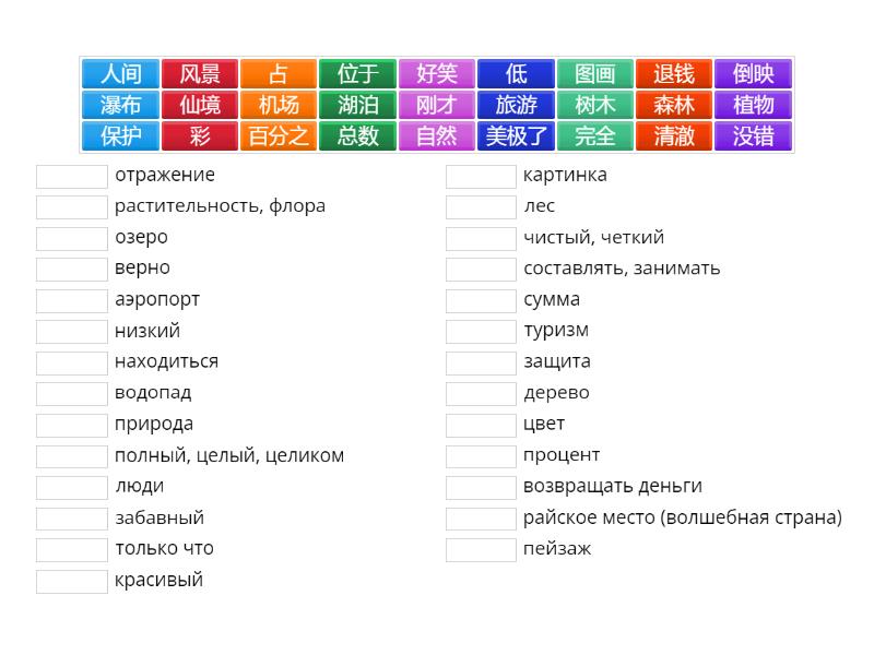 百分之 - процент, 保护 - защита, 彩 - цвет, 倒映 - отражение, 低 - низкий, 风景 - пейзаж, 刚才 - только что, 美极了 - красивый, 好笑 - забавный, 湖泊 - озеро, 机场 - аэропорт, 旅游 - туризм, 没错 - верно, 森林 - лес, 瀑布 - водопад, 清澈 - чистый, четкий, 人间 - люди, 树木 - дерево, 图画 - картинка, 退钱 - возвращать деньги, 占 - составлять, занимать, 完全 - полный, целый, целиком, 位于 - находиться, 仙境 - райское место (волшебная страна), 植物 - растительность, флора, 总数 - сумма, 自然 - природа,