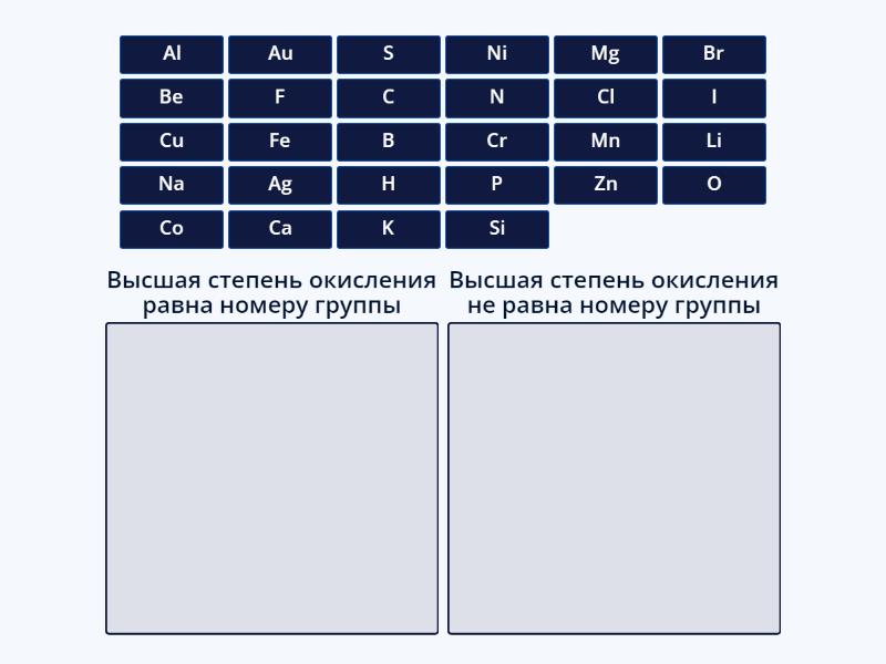 Высшая степень окисления равна номеру группы: H, Li, Na, K, Be, Mg, Ca, Zn, B, Al, Si, C, P, S, Cl, Br, I, Mn, Cr, N, Высшая степень окисления не равна номеру группы: O, F, Fe, Cu, Ag, Au, Co, Ni,