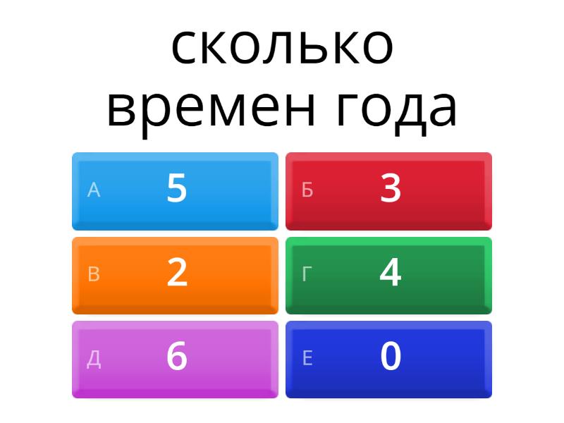 1) сколько времен года a) 5 b) 3 c) 2 d) 4 e) 6 f) 0 2) сколько месяцев в году a) 2 b) 24 c) 12 d) 8 e) 7 f) 4 3) сколько дней в неделе a) 2 b) 3 c) 7 d) 4 e) 5 f) 10
