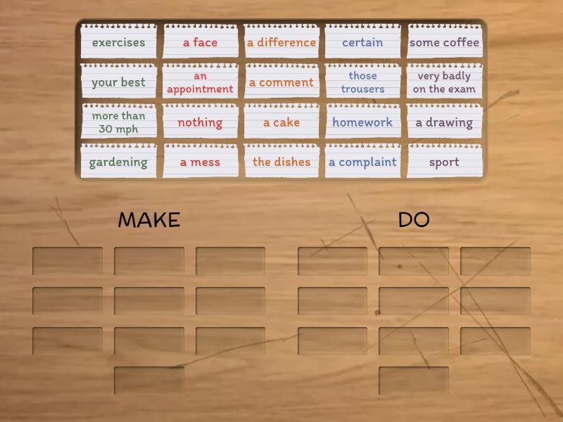 MAKE: a cake, some coffee, those trousers, a mess, an appointment, certain, a comment, a complaint, a difference, a face, DO: very badly on the exam, more than 30 mph, homework, your best, the dishes, nothing, a drawing, sport, exercises, gardening,