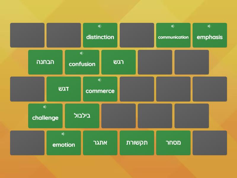challenge - אתגר, commerce - מסחר, communication - תקשורת, confusion - בילבול, distinction - הבחנה, emotion - רגש, emphasis - דגש, enable - לאפשר, identity - זהות, impression - רושם, protection - הגנה, recognition - הכרה, research - מחקר, struggle - מאבק,