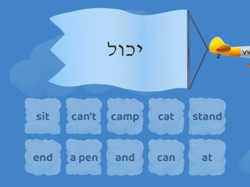 can - יכול, can't - לא יכול, at - ב, camp - מחנה, sit - יושב, stand - לעמוד, cat - חתול, a pen - עט, and - ו, end - סוף,