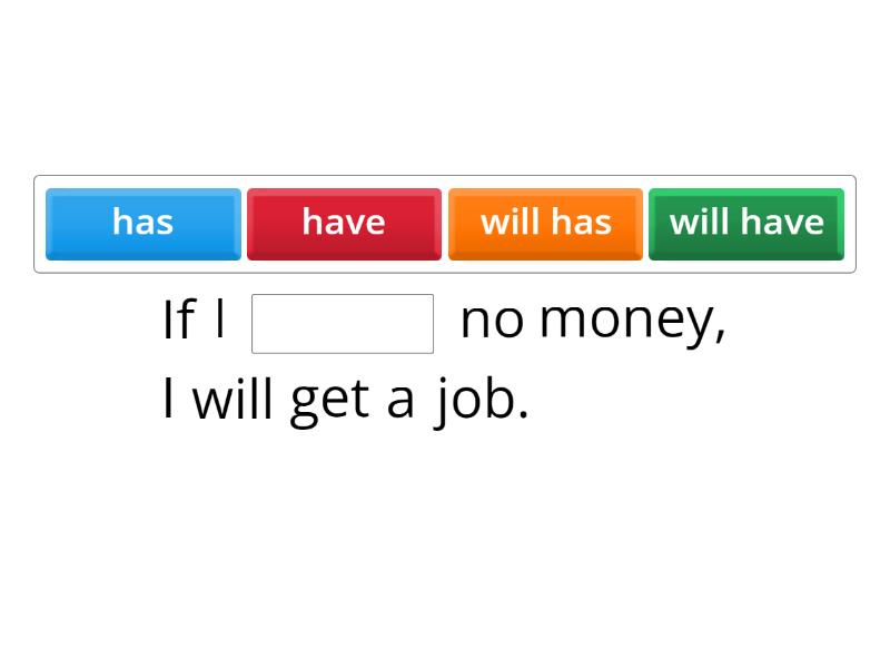If I ____ no money, I will get a job. If I get a job, I ____ hard. If I ____ hard, I will get a promotion. If I get a promotion, I ____ more money. If I ____ more money, I will go shopping. If I go shopping, I ____ a laptop. If I ____ a laptop, I will play games online. If I play games online, I ____ up late. If I ____ up late, I won't wake up on time. If I ____ up on time, I will miss the bus. If I ____ the bus, I will be late for work. If I am late for work, my boss ____ angry. If my boss ____ angry, he will shout at me. If he ____ at me, I will feel bad. If I feel bad, I ____ for a new job. If I look for a new job, I ____ lots of interviews. If I ____ lots of interviews, I will get a new job. If I get a new job, I ____ my money. If I ____ my money, I will go on holiday. If I go on holiday, my boss ____ me. If my boss ____ me, I will borrow $3000 from my friend. If I ____ $3000 from my friend, I will buy a new computer. If I buy a new computer, I ____ my own online business. If I ____ my own online business, I will be the boss. If I ____ the boss, I won't have to look for another job again!