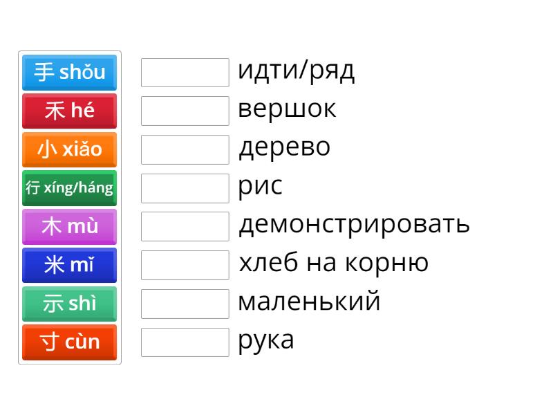 小 xiǎo - маленький, 示 shì - демонстрировать, 寸 cùn - вершок, 手 shǒu - рука, 行 xíng/háng - идти/ряд, 木 mù - дерево, 禾 hé - хлеб на корню, 米 mǐ - рис,