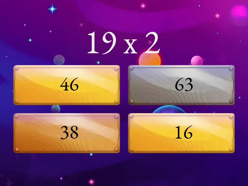 1) 19 х 2 a) 46 b) 63 c) 38 d) 16 2) 27 х 3 a) 87 b) 81 c) 58 d) 67 3) 24 х 4 a) 98 b) 69 c) 96 d) 89 4) 7 х 13 a) 91 b) 71 c) 61 d) 51 5) 14 х 6 a) 44 b) 84 c) 74 d) 64 6) 4 х 21 a) 64 b) 84 c) 74 d) 54 7) 13 х 5 a) 65 b) 35 c) 40 год d) 80 8) 5 х 12 a) 25 b) 52 c) 55 d) 60 9) 11 х 7 a) 71 b) 74 c) 77 d) 81 10) 43 х 2 a) 68 b) 88 c) 56 d) 86