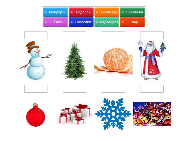 Подарок, Шар, Гирлянда, Снежинка, Ёлка, Дед Мороз, Снеговик, Мандарин,