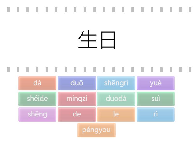 shēngrì - 生日, de - 的, le - 了, suì - 岁, shēng - 生, duō - 多, duōdà - 多大, dà - 大, yuè - 月, rì - 日, míngzi - 名字, péngyou - 朋友, shéide - 谁的,