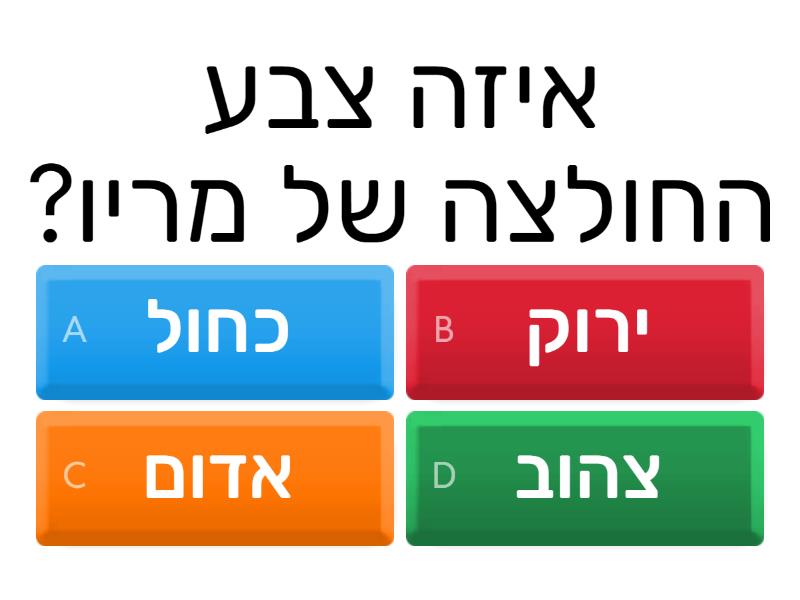 1) איזה צבע החולצה של מריו? a) כחול b) ירוק c) אדום d) צהוב 2) מה מריו אוהב לאכול כדי להיות גדול וחזק? a) בננה b) פטריה c) פרח d) המבורגר 3) מי החבר הכי טוב של מריו שלובש בגדים ירוקים? a) יושי b) פיץ' c) לואיג'י d) טוד 4) על איזו חיה מריו יכול לרכב? a) יושי הדרקון b) דונקי קונג הגורילה c) מיאו החתול d) ספיידרמן 5) מה מריו אוסף במשחק? a) מטבעות b) כוכבים c) אש d) פרחים 6) מה קורה כשמריו נוגע בכוכב? a) הוא נרדם b) הוא נהיה קטן c) הוא עף d) הוא מתחיל להבהב ונהיה חזק במיוחד 7) איזה פרח נותן למריו כוח לירות כדורי אש? a) פרח רגיל b) פרח האש c) חמנייה d) שושנה 8) מה מריו צריך להציל במשחק? a) את הארמון b) את לואיג'י c) את פיץ' d) את אלון