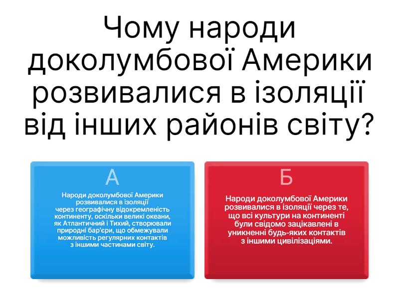 1) Чому народи доколумбової Америки розвивалися в ізоляції від інших районів світу? a) Народи доколумбової Америки розвивалися в ізоляції через географічну відокремленість континенту, оскільки великі океани, як Атлантичний і Тихий, створювали природні бар'єри, що обмежували можливість регулярних контактів з іншими частинами світу. b) Народи доколумбової Америки розвивалися в ізоляції через те, що всі культури на континенті були свідомо зацікавлені в уникненні будь-яких контактів з іншими цивілізаціями. 2) Чим займалися жителі Америки ? a) Скотарством b) Ловили рибу c) Торгівлею d) Землеробством 3) Що створила цивілізація мая? a) Сонячний календар b) Смартфони c) Письмо d) Одяг 4) Яка була улюблена розвага доколумбових народів? a) Гра в хокей b) Гра в м'яч c) Гра в хованки d) Гра підлога це лава 5) Як називали жителі народу кечуа свою країну? a) Землею чотирьох частин b) Країна хоробрих c) Країна волонтерів d) Країна чудес 6) Навіщо інки перетворювали гірські схили на тераси? a) Для тренування b) Для того щоб обробляти більше землі c) Для бійок d) Для розваг 7) Для передавання інформації інки користувалися... a) Особливим вилом письма-кіпу b) Руками c) Телефоном d) Танцями 8) Які народи заснували в Америці перші держави? ( 4 відповідей) a) Мая b) Єгиптяни c) Греки d) Ацтеки e) Інки f) Ольмеки