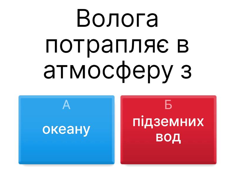 1) Волога потрапляє в атмосферу з a) океану b) підземних вод 2) Для розуміння кількості водяної пари в повітрі існує дві характеристики: a) абсолютна та відносна b) абсолютна та невідносна 3) Обчисліть відносну вологість , при температурі +30°С в ньому водяної пари: а) 18 г/м3 a) 90% b) 60% 4) яки з цих приладів вимірює вологість? a) гігрометр b) електронний гігрометр c) ваговий гігрометр d) гідрометр компас 5) вологість впливає на погоду? a) ні b) так 6) для здоров'я краща вологість a) 65% b) 30% 7) вологість вимірюється a) г/м3 b) см c) міліметри d) метри 8) гігрометр з грецької перекладається a) рідкий b) вимірюю c) вимірюю та рідкий d) рідкий та вимірюю 9) Обчисліть вологість повітря, якщо при температурі +30°С міститься водяної пари: 9 г/м3 a) 30% b) 40% c) 50% d) 60%