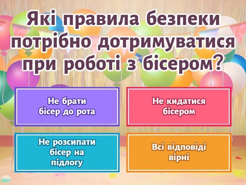 1) Які правила безпеки потрібно дотримуватися при роботі з бісером? a) Не брати бісер до рота b) Не кидатися бісером c) Не розсипати бісер на підлогу d) Всі відповіді вірні 2) Чому важливо мати гарне освітлення під час вишивання бісером? a) Щоб не боліли очі b) Щоб було видно всі деталі c) Щоб робота була акуратною d) Всі відповіді вірні 3) Які правила безпеки потрібно дотримуватися при роботі з голкою? a) Не залишати голку без нагляду b) Не встромляти голку в одяг c) Не передавати голку гострим кінцем вперед d) Всі відповіді вірні 4) Які правила безпеки потрібно дотримуватися при роботі з ножицями? a) Зберігати ножиці в чохлі b) Не бігати з ножицями в руках c) Не розмахувати ножицями d) Всі відповіді вірні 5) Чому важливо робити перерви під час вишивання бісером? a) Щоб відпочити b) Щоб розслабити очі c) Щоб запобігти втомі d) Всі відповіді вірні