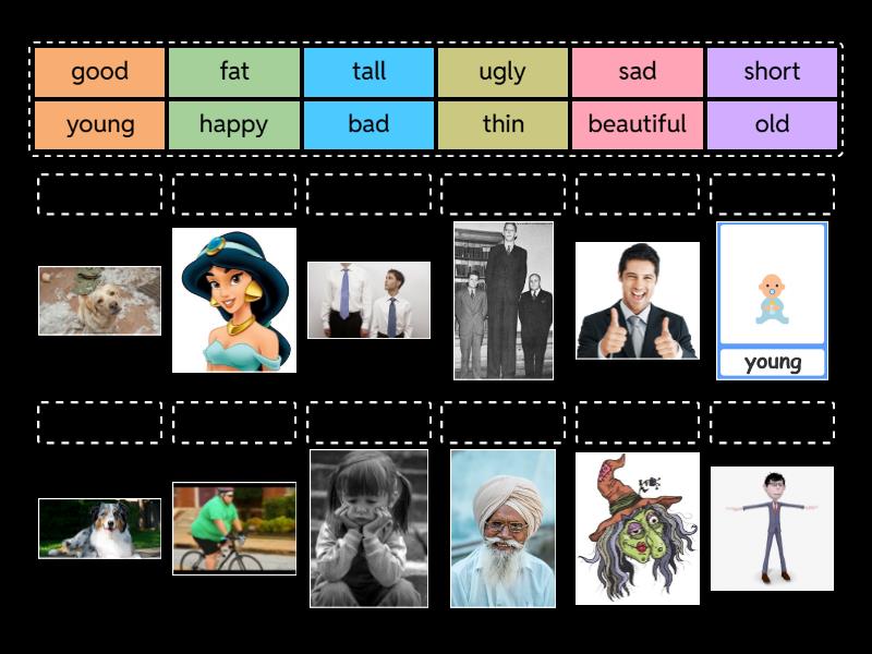 beautiful, ugly, tall, short, fat, thin, happy, sad, good, bad, old, young,