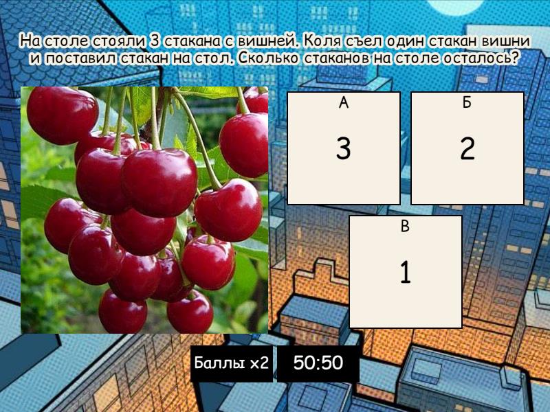1) У Толи две пары варежек. Сколько у него варежек на левую руку? a) 1 b) 2 c) 4 2) На столе стояли 3 стакана с вишней. Коля съел один стакан вишни и поставил стакан на стол. Сколько стаканов на столе осталось? a) 3 b) 2 c) 1 3) Прилетели 2 чижа, 2 стрижа и 2 ужа. Сколько птиц стало возле дома? a) 2 b) 6 c) 4 4) В тарелке лежали три морковки и четыре яблока. Сколько фруктов было на тарелке? a) 4 b) 7 c) 6 5) Стала курица считать маленьких цыпляток: Жёлтых пять и черных пять, а всего … ? a) 10 b) 5 c) 15 6) Когда цапля стоит на одной ноге, то она весит 4 кг. Сколько будет весить цапля, если она встанет на две ноги? a) 8 b) 4 c) 6 7) Шел старик из лесу, а навстречу ему два старика. Сколько всего стариков идут в лес? a) 1 b) 3 c) 2 8) Трое зайчат по дороге идут. За ними вдогонку двое домой бегут. Сколько зайчат домой спешат? a) 5 b) 3 c) 2 9) Бабушка связала Нине две пары носков. Сколько носков связала бабушка Нине? a) 2 b) 4 c) 6 10) Бабушка положила в тарелку 12 груш. После того как внуки взяли с тарелки по 1 груше, осталось 8 груш. Сколько у бабушки внуков? a) 11 b) 9 c) 4