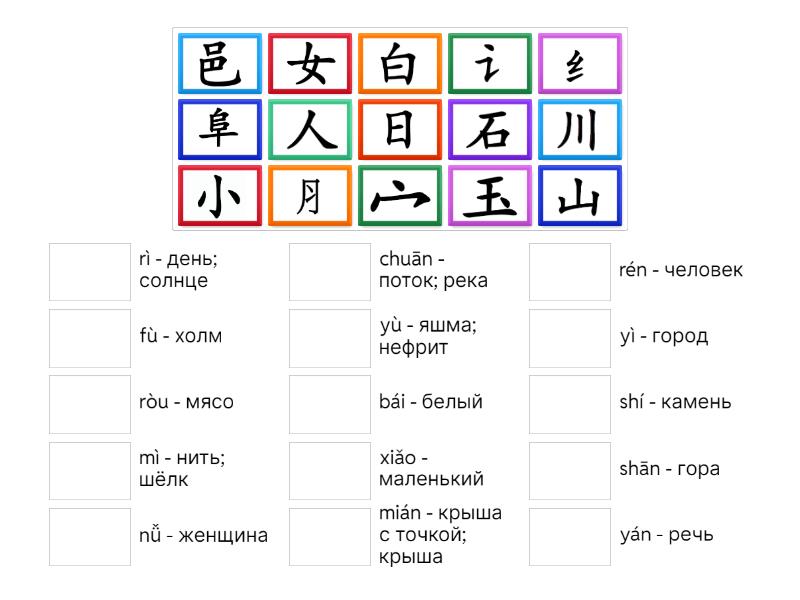 mì - нить; шёлк, xiǎo - маленький, bái - белый, yán - речь, fù - холм, shí - камень, rén - человек, yì - город, rì - день; солнце, ròu - мясо, yù - яшма; нефрит, shān - гора, mián - крыша с точкой; крыша, nǚ - женщина, chuān - поток; река,
