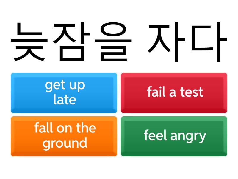 1) 늦잠을 자다 a) get up late b) fail a test c) fall on the ground d) feel angry 2) 지갑을 잃어버리다 a) arrive late to school b) lose my wallet c) can’t play with my friend d) hurt my finger 3) 시험에서 떨어지다 a) feel angry b) have to go to the hospital c) fail a test d) arrive late to school 4) 숙제를 잊어버리다 a) forget my homework b) have to buy a new book c) fall on the ground d) argue with my friend 5) 친구와 다투다 a) can’t take the bus b) drop my ice cream on the floor c) get wet in the rain d) argue with my friend 6) 바닥으로 넘어지다 a) have to take the test again b) fall on the ground c) arrive late to school d) miss the bus 7) 껌을 밟다 a) slip on the bathroom floor b) have to change my shoes c) step in gum d) leave my umbrella at home 8) 아침을 먹을 시간이 없다 a) don’t have time for breakfast b) fail a test c) get wet in the rain d) have to change my shoes 9) 집으로 돌아가야만 하다 a) have to go back home b) have to change my shoes c) feel angry d) have to go to the hospital 10) 시험을 다시 봐야만 하다 a) arrive late to school b) have to take the test again c) fall on the ground d) have to fix the toy car 11) 신발을 갈아 신어야만 하다 a) break my sister ’s toy car b) spill milk on my book c) have to change my shoes d) can’t take the bus 12) 여동생의 장난감 차를 부러뜨리다 a) break my sister ’s toy car b) step in gum c) forget my homework d) lose my wallet 13) 장난감 차를 고쳐야만 하다 a) forget my homework b) have to fix the toy car c) spill milk on my book d) drop my ice cream on the floor 14) 버스를 탈 수 없다 a) can’t take the bus b) argue with my friend c) don’t have time for breakfast d) slip on the bathroom floor 15) 친구와 놀 수 없다 a) can’t play with my friend b) feel angry c) miss the bus d) have to take the test again 16) 아이스크림을 바닥에 떨어뜨리다 a) slip on the bathroom floor b) spill milk on my book c) drop my ice cream on the floor d) step in gum 17) 화가 나다 a) have to fix the toy car b) feel angry c) get up late d) have to change my shoes 18) 병원에 가야만 하다 a) have to go to the hospital b) break my sister ’s toy car c) arrive late to school d) get wet in the rain 19) 화장실 바닥에서 미끄러지다 a) spill milk on my book b) arrive late to school c) hurt my finger d) slip on the bathroom floor 20) 손가락을 다치다 a) hurt my finger b) step in gum c) fail a test d) argue with my friend 21) 우산을 집에 놔두고 오다 a) arrive late to school b) spill milk on my book c) leave my umbrella at home d) get wet in the rain 22) 비를 맞아 젖다 a) feel angry b) can’t take the bus c) get wet in the rain d) leave my umbrella at home 23) 버스를 놓치다 a) fail a test b) lose my wallet c) have to go back home d) miss the bus 24) 학교에 늦게 도착하다 a) arrive late to school b) miss the bus c) spill milk on my book d) forget my homework 25) 우유를 책에 쏟다 a) have to go back home b) fall on the ground c) spill milk on my book d) fail a test 26) 새 책을 사야만 하다 a) forget my homework b) have to buy a new book c) have to go to the hospital d) don’t have time for breakfast