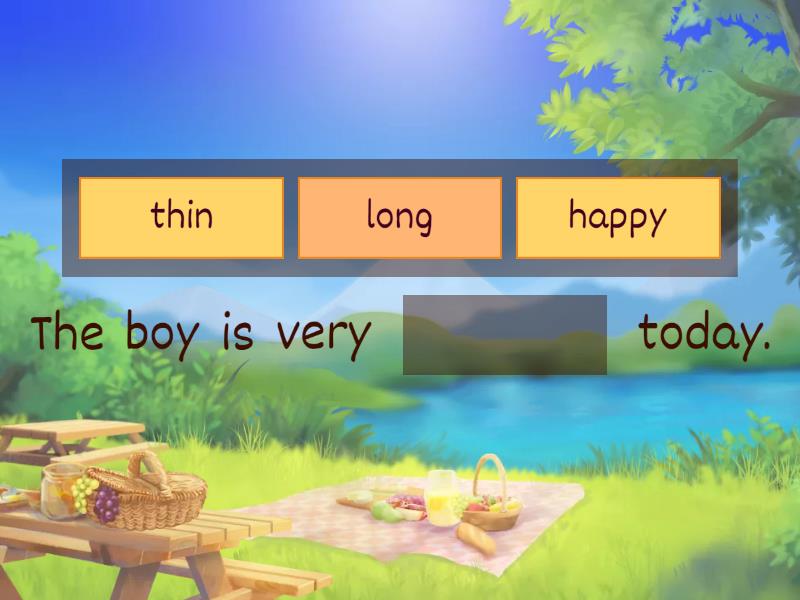 The boy is very ____ today. This girl is ____ today. That women are very ____. Those men are ____ and ____. This kitten is ____. What's a ____ day, today! I have got a ____ bag. 🎒 The chimps are ____ and ____. She has ____, ____ hair. Jack's mum has got ____,curly hair. The cheetahs 🐆 run very ____. It's my ____ friend. He drives very ____ road. I like ____ stories. Mark buy an ____ car. I'm ____ today. Helen has got a ____ son. The jug is ____. I'm ____ of love. She is so ____. His brother is very ____ and ____.