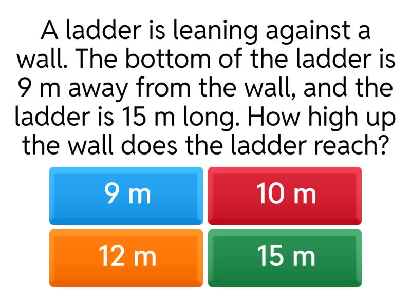 1) A ladder is leaning against a wall. The bottom of the ladder is 9 m away from the wall, and the ladder is 15 m long. How high up the wall does the ladder reach? a) 9 m b) 10 m c) 12 m d) 15 m 2) A rectangular park has a length of 24 m and a width of 7 m. What is the length of the diagonal of the park? a) 20 m b) 23 m c) 25 m d) 30 m 3) A right-angled triangle has sides 8 cm and 15 cm. Find the length of the hypotenuse. a) 16cm b) 17 cm c) 18 cm d) 20 cm 4) A wooden plank rests against a wall 12 m high. If the plank is 13 m long, how far is the bottom of the plank from the wall? a) 4 m b) 5 m c) 6 m d) 7 m 5) A right-angled triangle has a hypotenuse of 10 cm and one side of 6 cm. Find the other side. a) 6 cm b) 7 cm c) 8 cm d) 9 cm