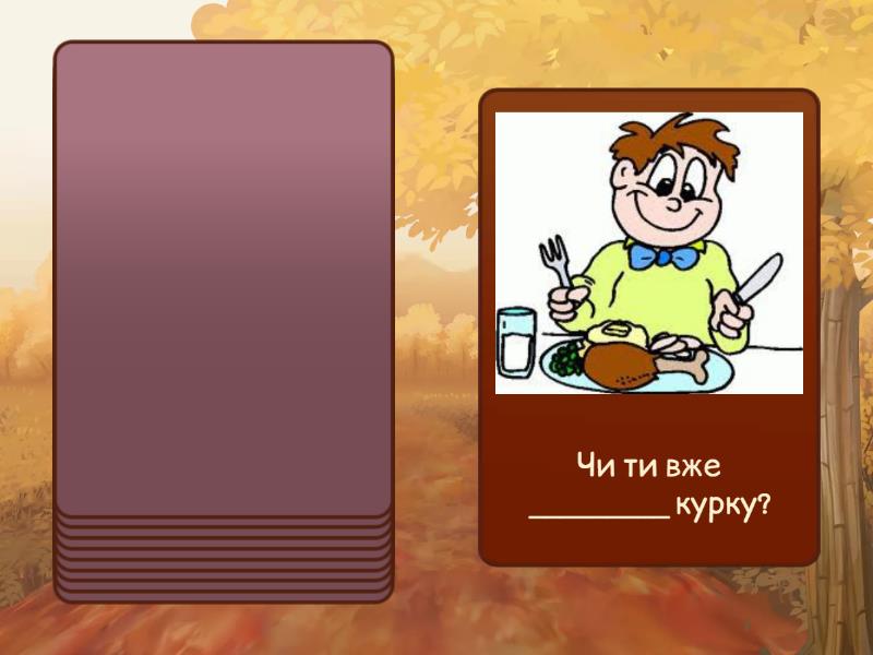 Чи ти вже ______________ домашнє завдання? , - Алло, ти вже __________ продукти? Я чекаю на тебе біля входу. , Чи ти вже _________ курку?, Чи ти вже _________ всю воду?, Чи ти вже ____________ новий серіал? Дуже цікавий!, Чи ти вже ________________ светр? Ми на тебе чекаємо вже 10 хвилин!, - Чому ти така щаслива? - Тому, що я ____________ усі вихідні!, - Що ти минулої неділі _________ у ресторані? - Здається, піцу. , - Що Олена ___________ тобі вчора? - Подарунок на день народження., - Що ти _________ цілий ранок? - Ключі. - І знайшов? - На жаль, ні..